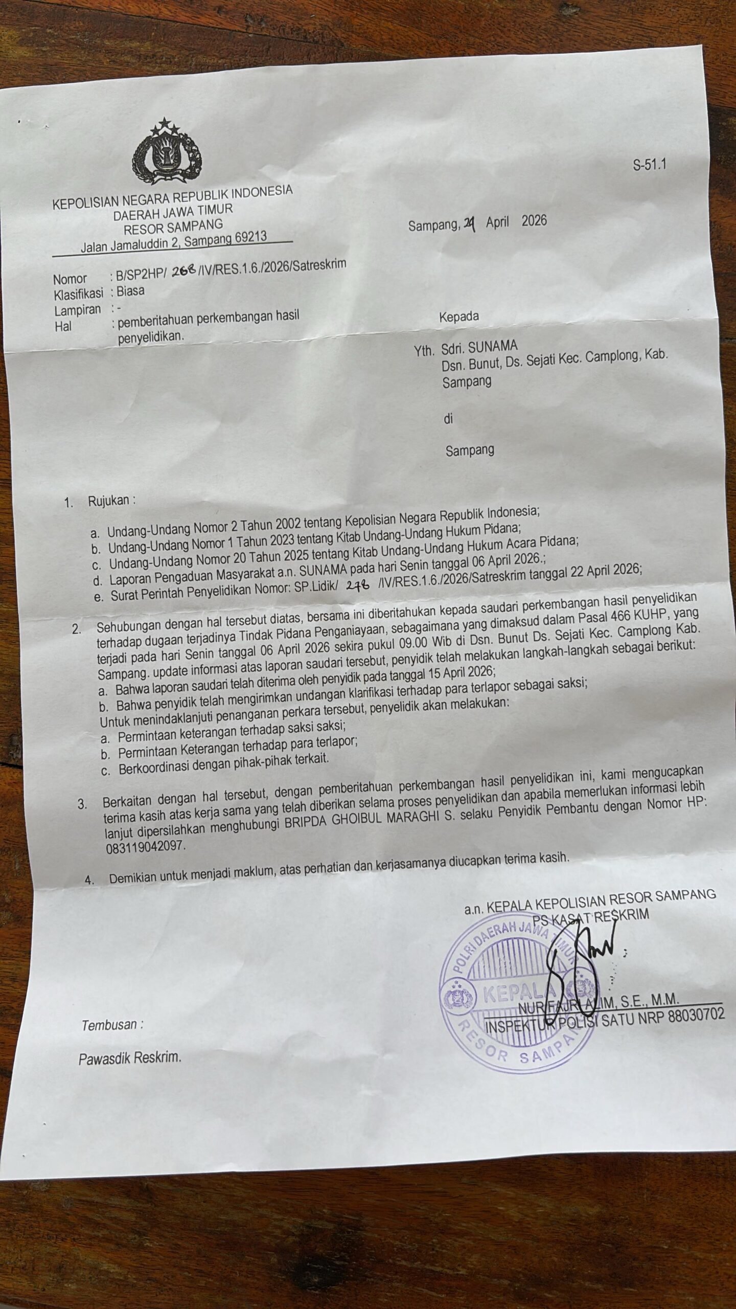 Namun, perkembangan penanganan perkara ini menuai sorotan. Berdasarkan dokumen resmi Surat Pemberitahuan Perkembangan Hasil Penyelidikan (SP2HP) tertanggal 24 April 2026, penyidik baru melakukan langkah awal berupa penerimaan laporan serta pengiriman undangan klarifikasi kepada pihak terlapor.