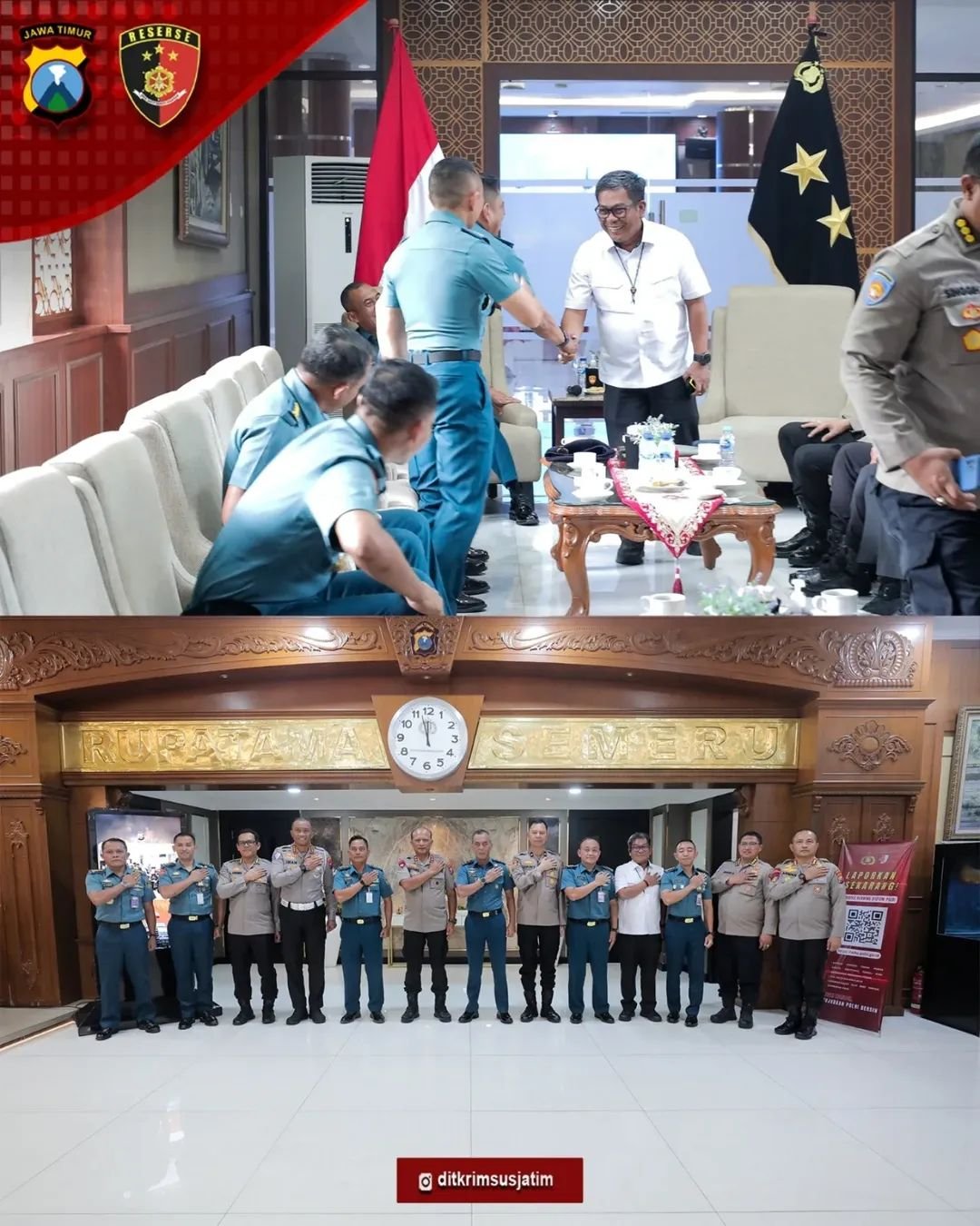 Pertemuan tersebut berlangsung dalam suasana hangat dan penuh keakraban, mencerminkan soliditas serta komitmen kuat antara Polri dan TNI Angkatan Laut dalam menjaga stabilitas keamanan, khususnya di wilayah Jawa Timur yang memiliki karakteristik strategis, baik dari sisi darat maupun perairan.