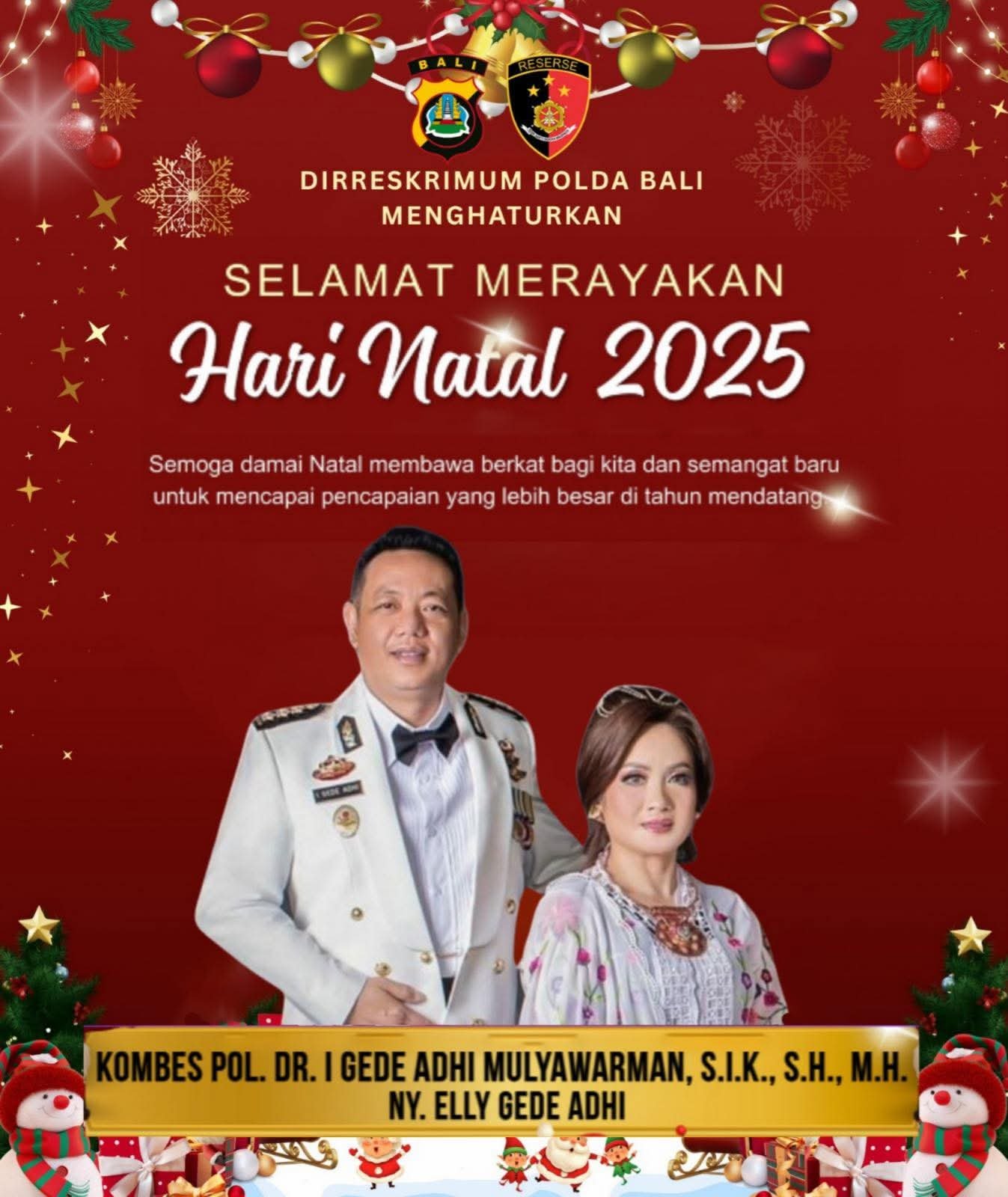 Zonacakrawala.com | Denpasar – Direktur Reserse Kriminal Umum (Dirreskrimum) Polda Bali, Kombes Pol. Dr. I Gede Adhi Mulyawarman, S.I.K., S.H., M.H., bersama istri Ny. Elly Gede Adhi, menyampaikan ucapan Selamat Merayakan Hari Natal 2025 kepada seluruh umat Kristiani di Indonesia.
