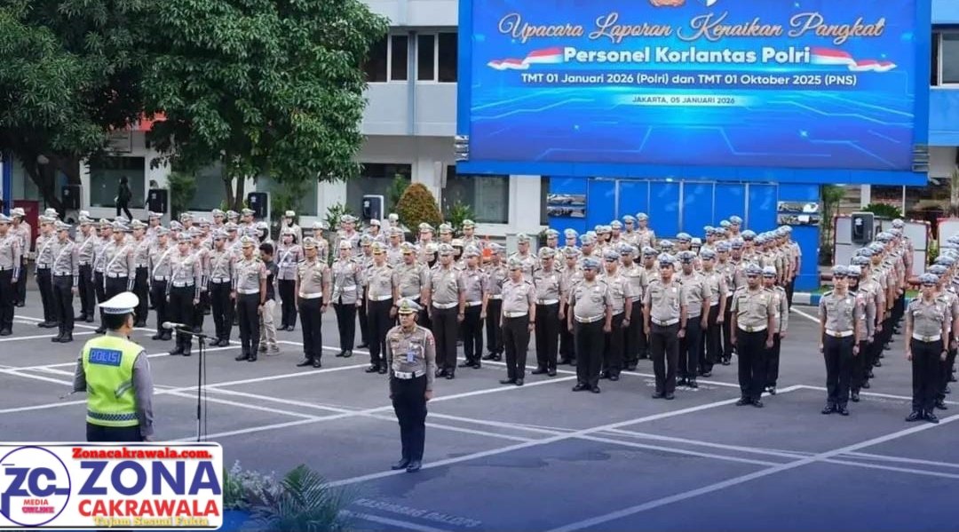 zonacakrawala.com. Jakarta, – Kepala Korps Lalu Lintas (Kakorlantas) Polri, Irjen Pol. Drs. Agus Suryonugroho, S.H., M.Hum., memimpin upacara laporan kenaikan pangkat bagi personel Korlantas Polri di Lapangan NTMC Polri, Jakarta, Senin (5/1/2026). Kenaikan pangkat ini resmi berlaku terhitung mulai tanggal (TMT) 1 Januari 2026 bagi personel Polri dan TMT 1 Oktober 2025 bagi Pegawai Negeri Sipil (PNS).