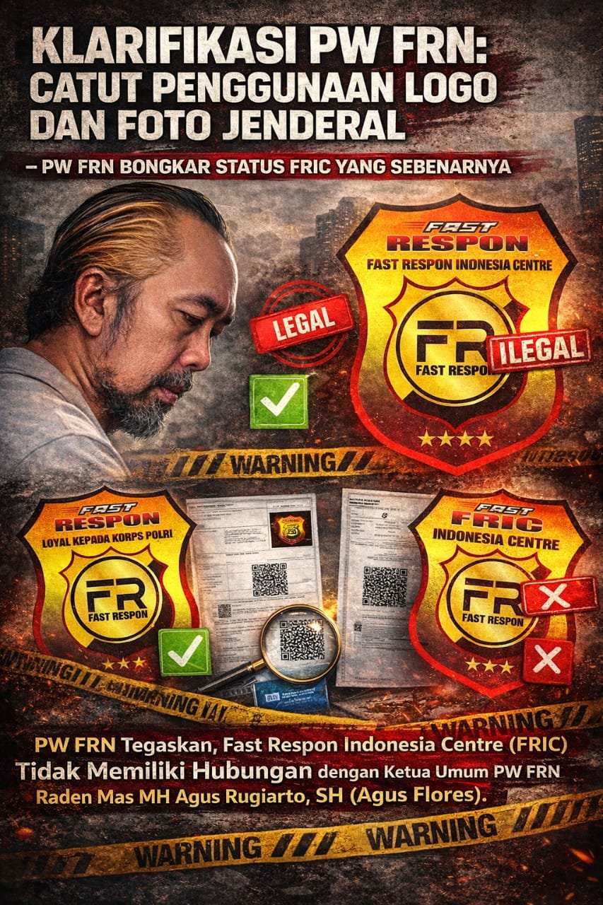 Zonacakrawala.com | Jakarta, – Pengurus Wilayah Fast Respon Nusantara (PW FRN) secara resmi mengeluarkan pernyataan klarifikasi terkait maraknya penggunaan logo PW FRN dan pemasangan foto perwira tinggi Polri pada atribut spanduk maupun banner yang mengatasnamakan FRIC.