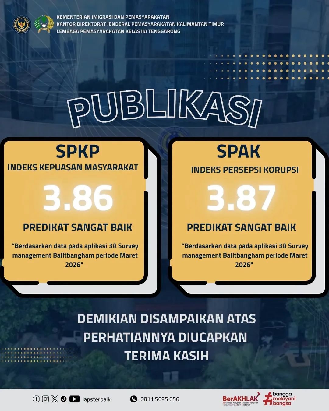Pihak Lapas Kelas IIA Tenggarong menyampaikan bahwa hasil tersebut tidak terlepas dari kerja keras seluruh jajaran dalam meningkatkan profesionalisme, transparansi, dan akuntabilitas dalam setiap aspek pelayanan.