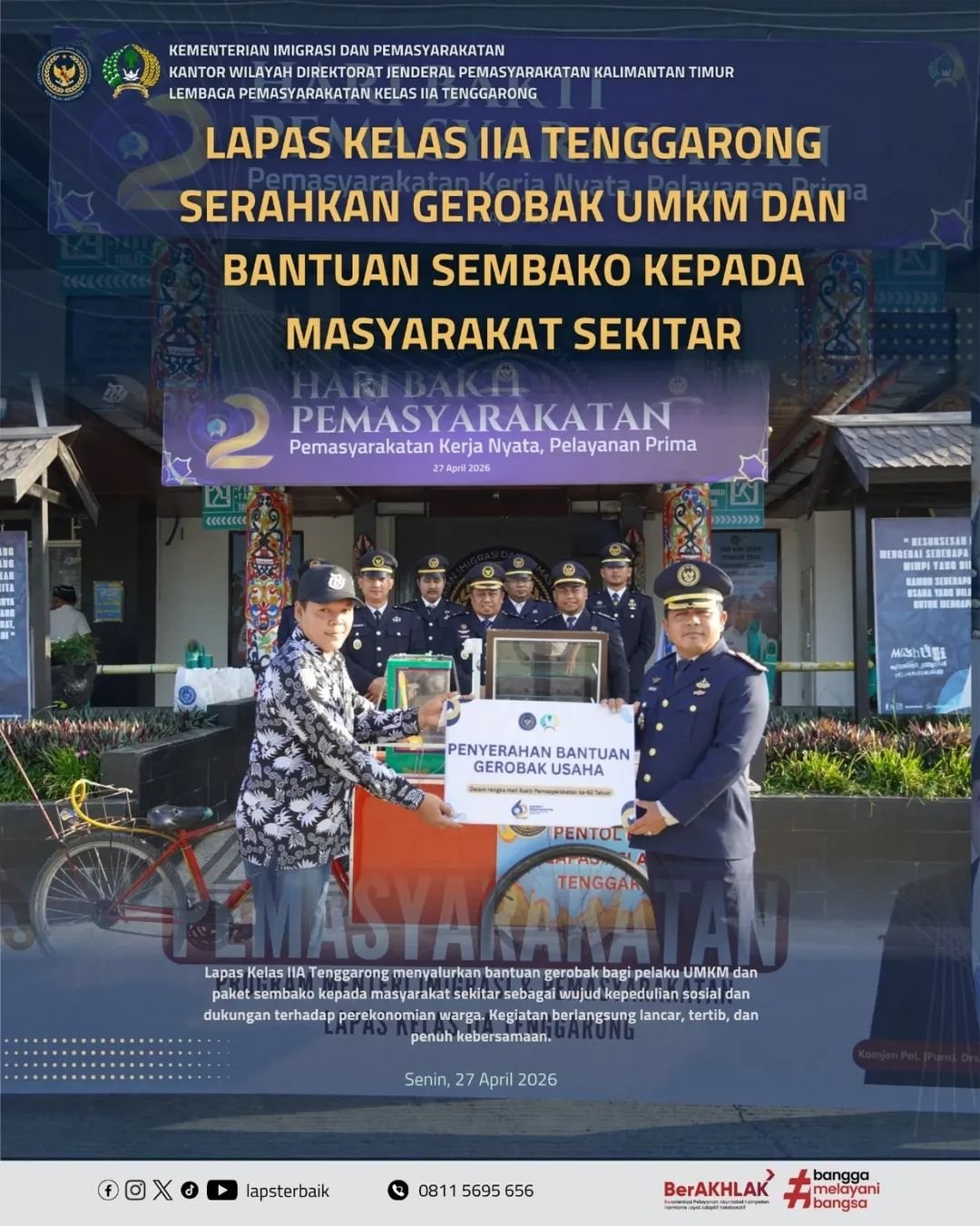 Zonacakrawala.com | Tenggarong – Dalam rangka meningkatkan kepedulian sosial serta mendukung pemberdayaan ekonomi masyarakat, Lembaga Pemasyarakatan Kelas IIA Tenggarong melaksanakan kegiatan penyerahan gerobak kepada pelaku UMKM serta penyaluran paket sembako kepada warga sekitar, pada Senin, 27 April 2026, pukul 07.30 WITA hingga selesai, bertempat di halaman Lapas Kelas IIA Tenggarong.