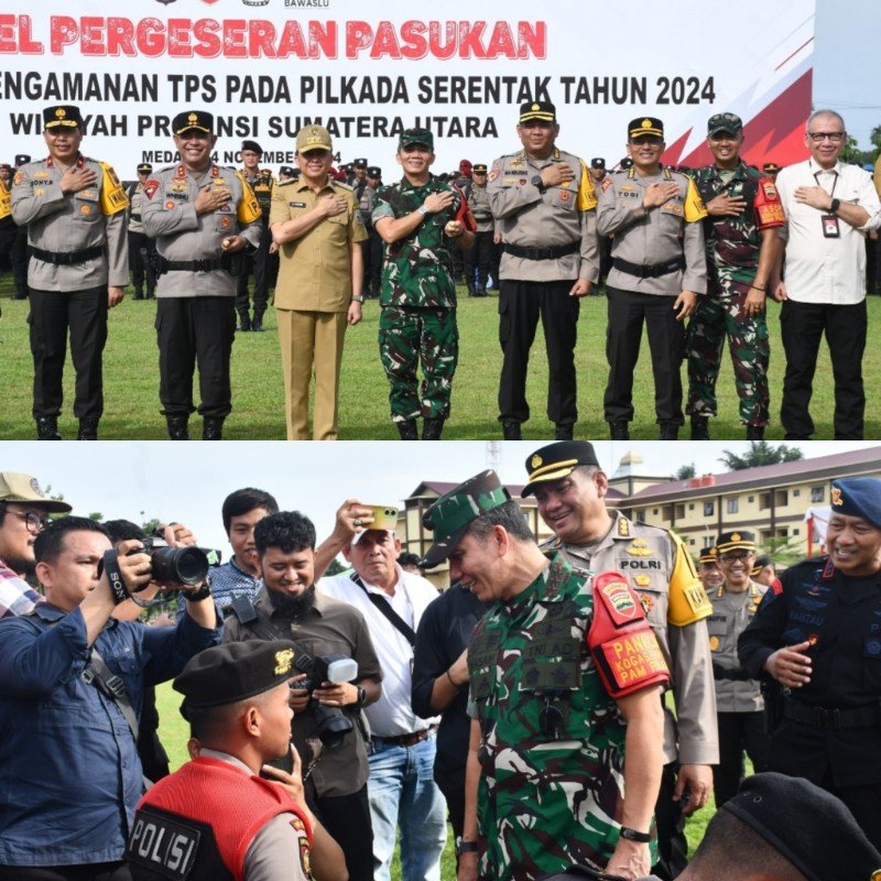 Zonacakrawala.com. Medan – Pangdam I/BB, Letjen TNI Mochammad Hasan bersama Pj Gubsu, Dr Drs Agus Fatoni, MSi, menghadiri apel pergeseran pasukan dalam rangka Pengamanan Tempat Pemungutan Suara (TPS) Pilkada Serentak Tahun 2024 Provinsi Sumatera Utara bertempat di Lapangan Sepak Bola Ditsamapta Polda Sumut, Minggu (24/11/2024).
