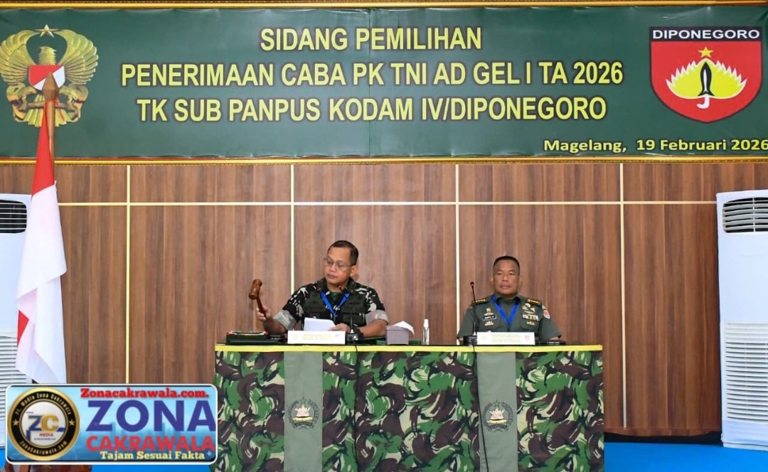 zonacakrawala.com. Magelang – Pangdam IV/Diponegoro memimpin Sidang Sub Panpus Penerimaan Calon Bintara Prajurit Karier (Caba PK) TNI AD Gelombang I TA 2026 di Aula A. Yani, Rindam IV/Diponegoro, Kamis (19/2/2026). Kegiatan ini merupakan bagian dari tahapan seleksi tingkat daerah dalam rangka menjaring calon prajurit Bintara yang akan melanjutkan proses ke tingkat pusat.