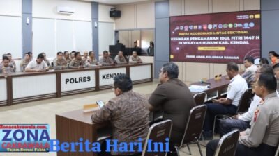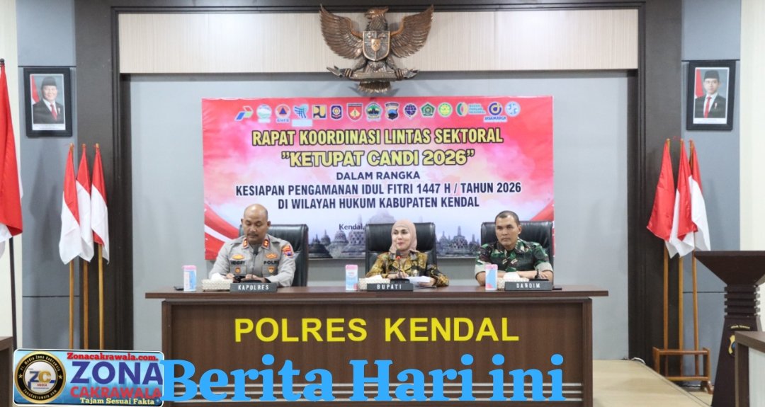 zonacakrawala.com. KENDAL — Polres Kendal menggelar rapat koordinasi lintas sektoral untuk mempersiapkan pengamanan Hari Raya Idul Fitri 1447 Hijriah tahun 2026 di Aula Tri Brata Polres Kendal, Kamis (12/3/2026) pukul 14.00–15.00 WIB. Kegiatan ini melibatkan unsur Forum Koordinasi Pimpinan Daerah (Forkopimda) serta sejumlah instansi terkait guna memastikan kesiapan pengamanan arus mudik dan perayaan Lebaran di wilayah Kabupaten Kendal.