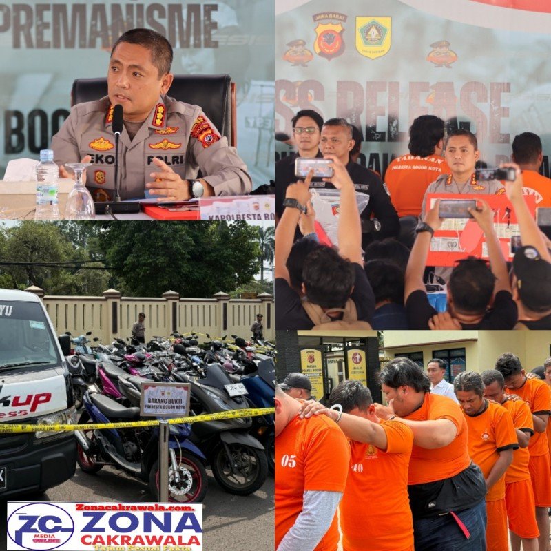 zonacakrawala.com. Jakarta. Polres Bogor bersama Polresta Bogor Kota menggelar konferensi pers kasus perampasan motor oleh debt collector (mata elang). Hal tersebut menjadi bukti serius penindakan premanisme di wilayah Bogor Raya.