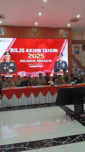 Zonacakrawala.com | Sidoarjo – Polresta Sidoarjo menggelar rilis akhir tahun 2025 di Gedung Mapolresta Sidoarjo, Selasa (30/12/2025). Dalam kegiatan tersebut disampaikan capaian kinerja kepolisian sepanjang tahun 2025 yang menunjukkan tren positif, khususnya pada penurunan angka kriminalitas dan peningkatan pengungkapan kasus narkoba.