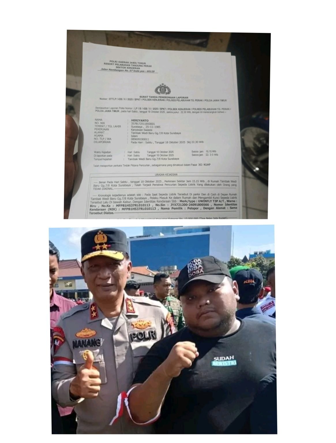 Zonacakrawala.com | Surabaya, 18 Oktober 2025 — Aksi pencurian kembali terjadi di wilayah hukum Polsek Kenjeran, Surabaya. Kali ini, sebuah sepeda listrik milik warga Tambak Wedi Baru Gg. 7/8 Kota Surabaya raib digondol maling pada Sabtu (18/10/2025) sore. Kasus ini telah resmi dilaporkan ke pihak kepolisian melalui Surat Tanda Terima Laporan (STTLP) Nomor: STTLP/2438/X/2025/GPKT/POLSEK KENJERAN/POLRES PELABUHAN TANJUNG PERAK/POLDA JAWA TIMUR, dengan dasar Laporan Polisi Nomor: LP/B/438/X/2025/SPKT/POLSEK KENJERAN/POLRES PELABUHAN TANJUNG PERAK/POLDA JAWA TIMUR.
