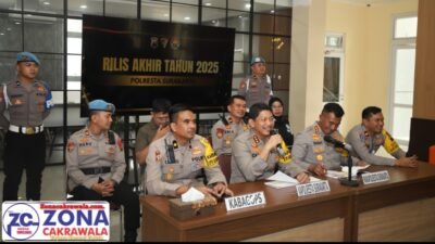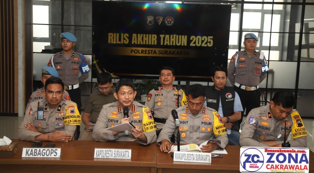 zonacakrawala.com. Polresta Surakarta – Polda Jateng – Mengakhiri tahun 2025, Polresta Surakarta menggelar Press Release Akhir Tahun sebagai bentuk transparansi dan pertanggungjawaban kinerja kepada publik. Kegiatan ini dipimpin langsung oleh Kapolresta Surakarta Kombes Pol Catur Cahyono Wibowo, SIK, MH, didampingi Wakapolresta Surakarta AKBP Sigit, SIK, MH, serta para Pejabat Utama (PJU) Polresta Surakarta. Kegiatan berlangsung di Lobby Mapolresta Surakarta, Selasa (30/12/2025).