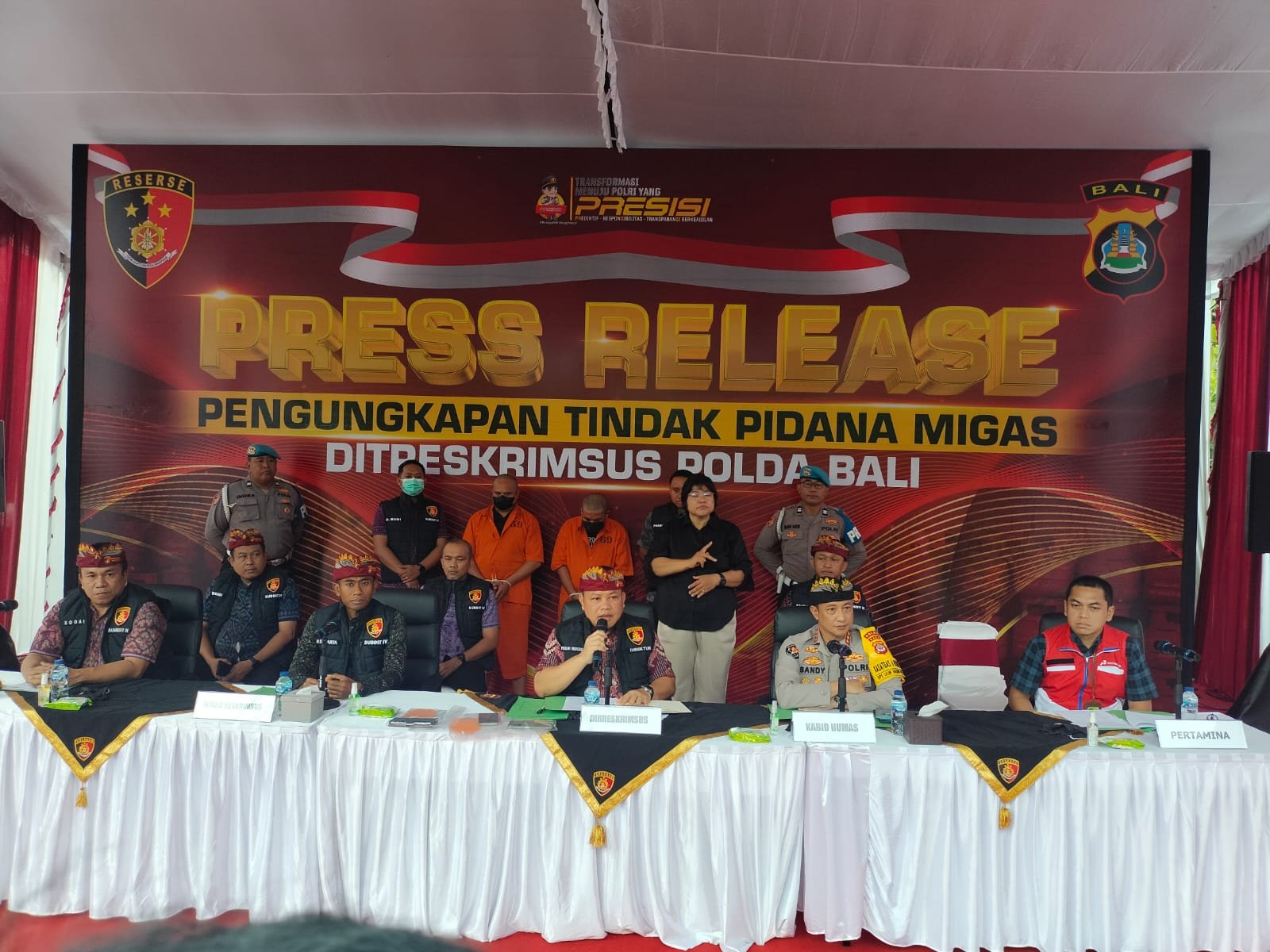 Direskrimsus Kombes Pol Teguh Widodo S.I.K., M.M., didampingi Kabid Humas, Wadireskrimsus, Kasubdit IV Ditreskrimsus dan perwakilan dari pertamina, menyampaikan;